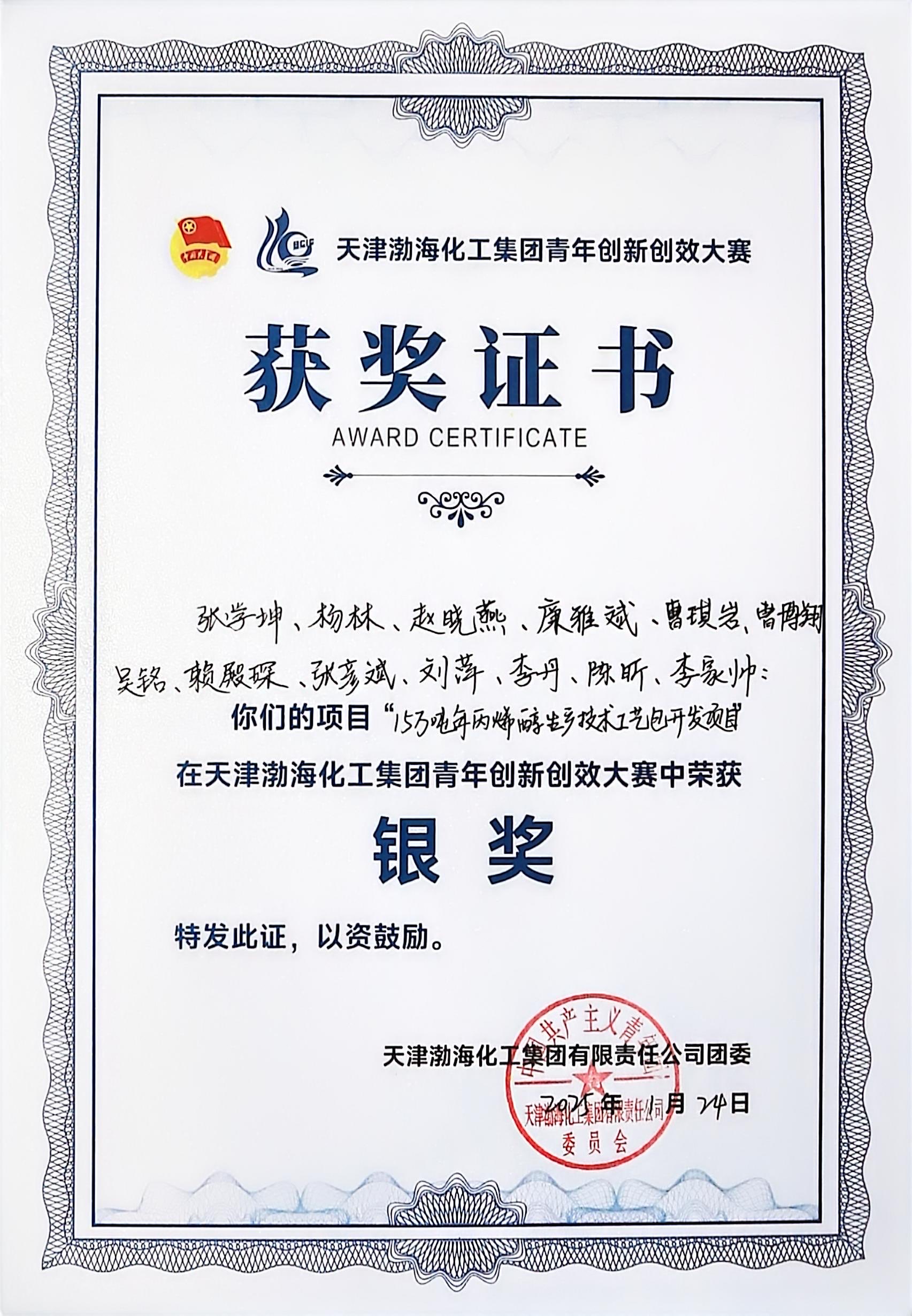 【喜報】渤化工程榮獲天津渤?;ぜ瘓F(tuán)青年創(chuàng)新創(chuàng)效大賽銀獎 2025-01-24 11:24:52 近日,渤化工程“15萬噸/年丙烯醇生產(chǎn)技術(shù)工藝包開發(fā)項目”榮獲天津渤?;ぜ瘓F(tuán)青年創(chuàng)新創(chuàng)效大賽銀獎。 “丙烯為原料制丙烯醇生產(chǎn)工藝”的技術(shù)攻關(guān),將與下游BDO工藝銜接,形成由丙烯制BDO的完整工藝鏈,帶來可觀的經(jīng)濟(jì)效益和社會效益。 秉承“嚴(yán)謹(jǐn)務(wù)實,高效創(chuàng)新”的宗旨,渤化工程將繼續(xù)聚焦工藝改進(jìn)、技術(shù)創(chuàng)新攻堅,匯聚青年之智、青年之力,在高質(zhì)量發(fā)展進(jìn)程中奮發(fā)圖強(qiáng)、創(chuàng)新創(chuàng)效。